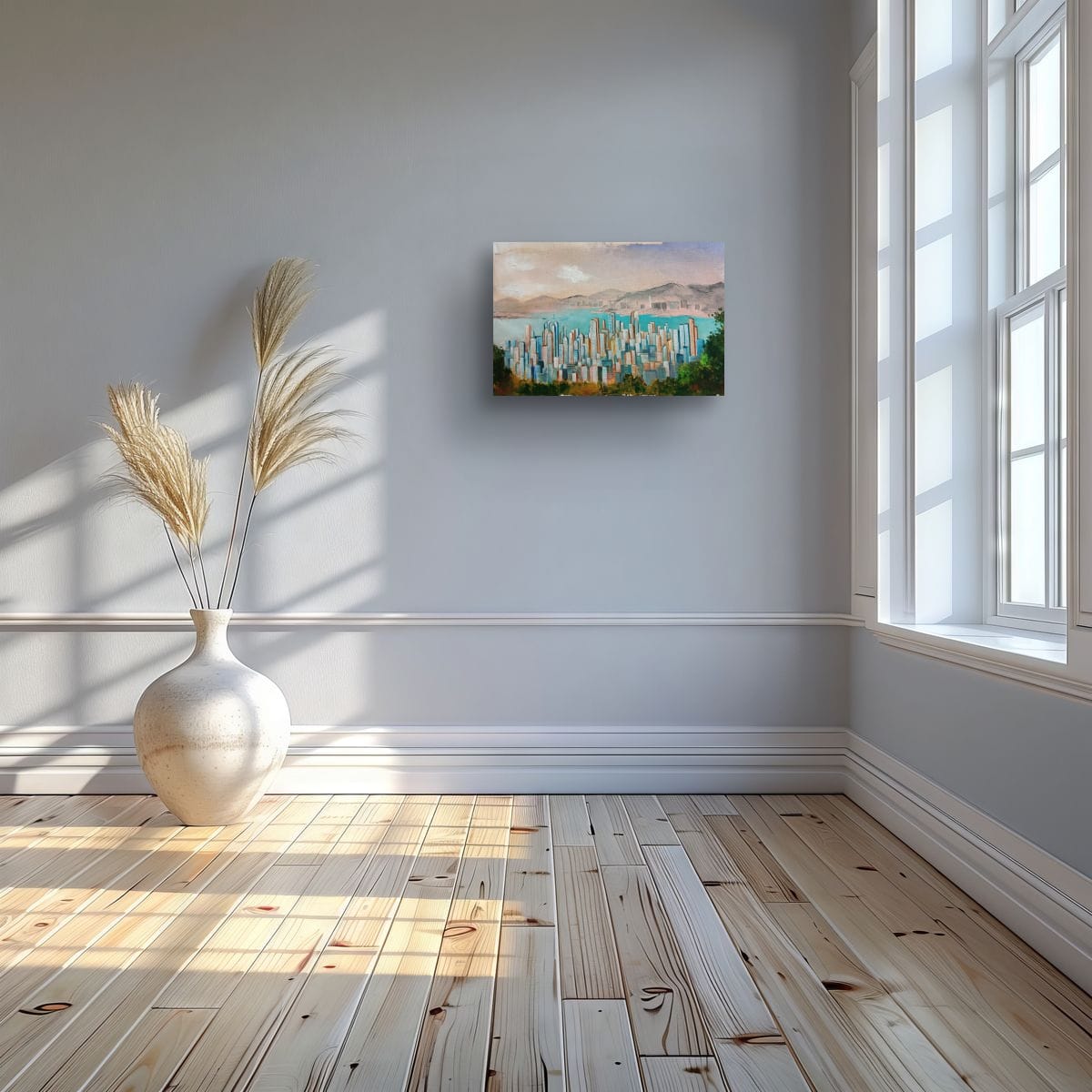 Painted with expressive acrylic brushstrokes, the artwork balances the structured forms of buildings with a calm natural backdrop of water and mountains. This contrast creates a visually harmonious scene that combines urban progress with natural serenity.
