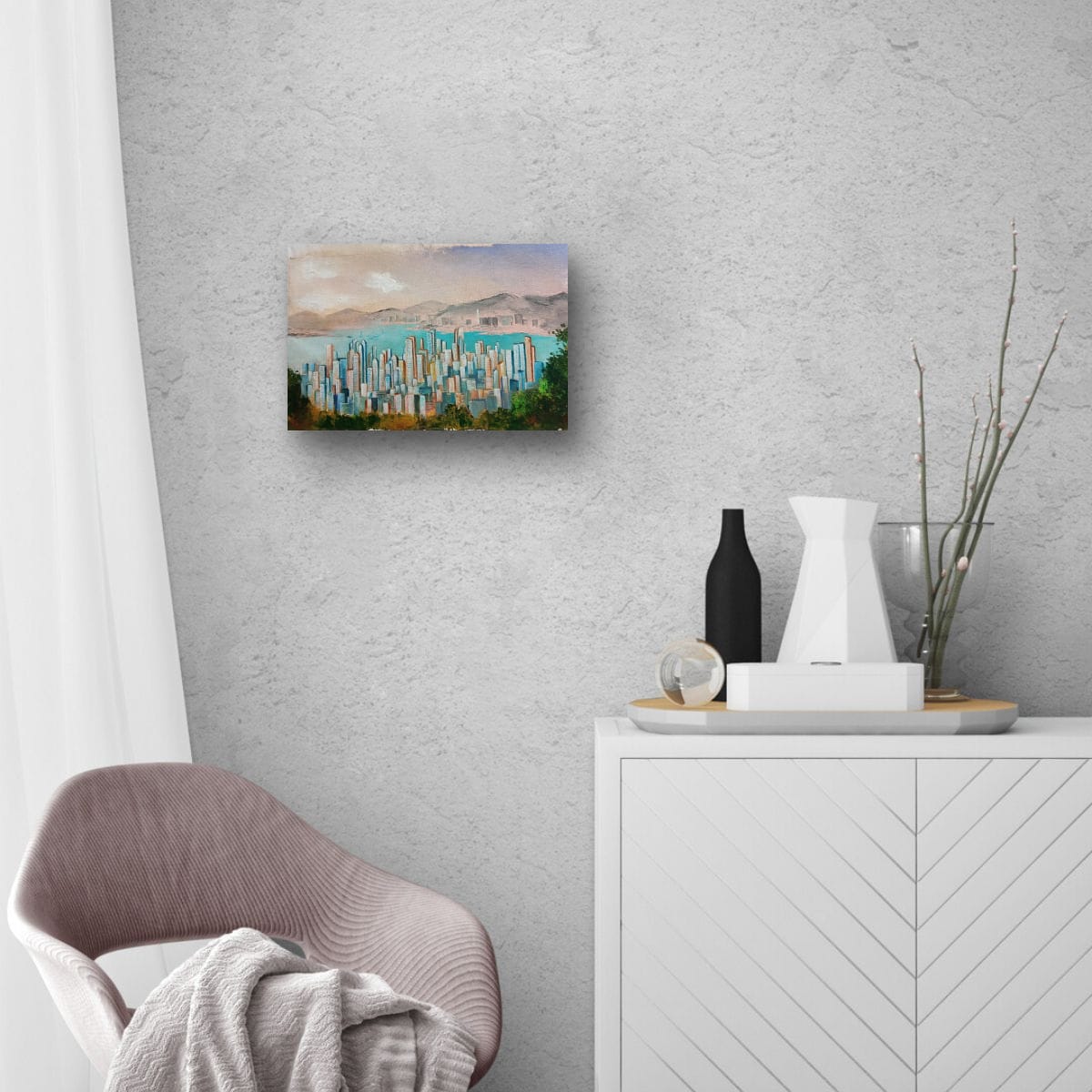 The painting’s layered skyline composition gives depth and perspective, allowing viewers to appreciate the complexity and beauty of a modern city landscape.