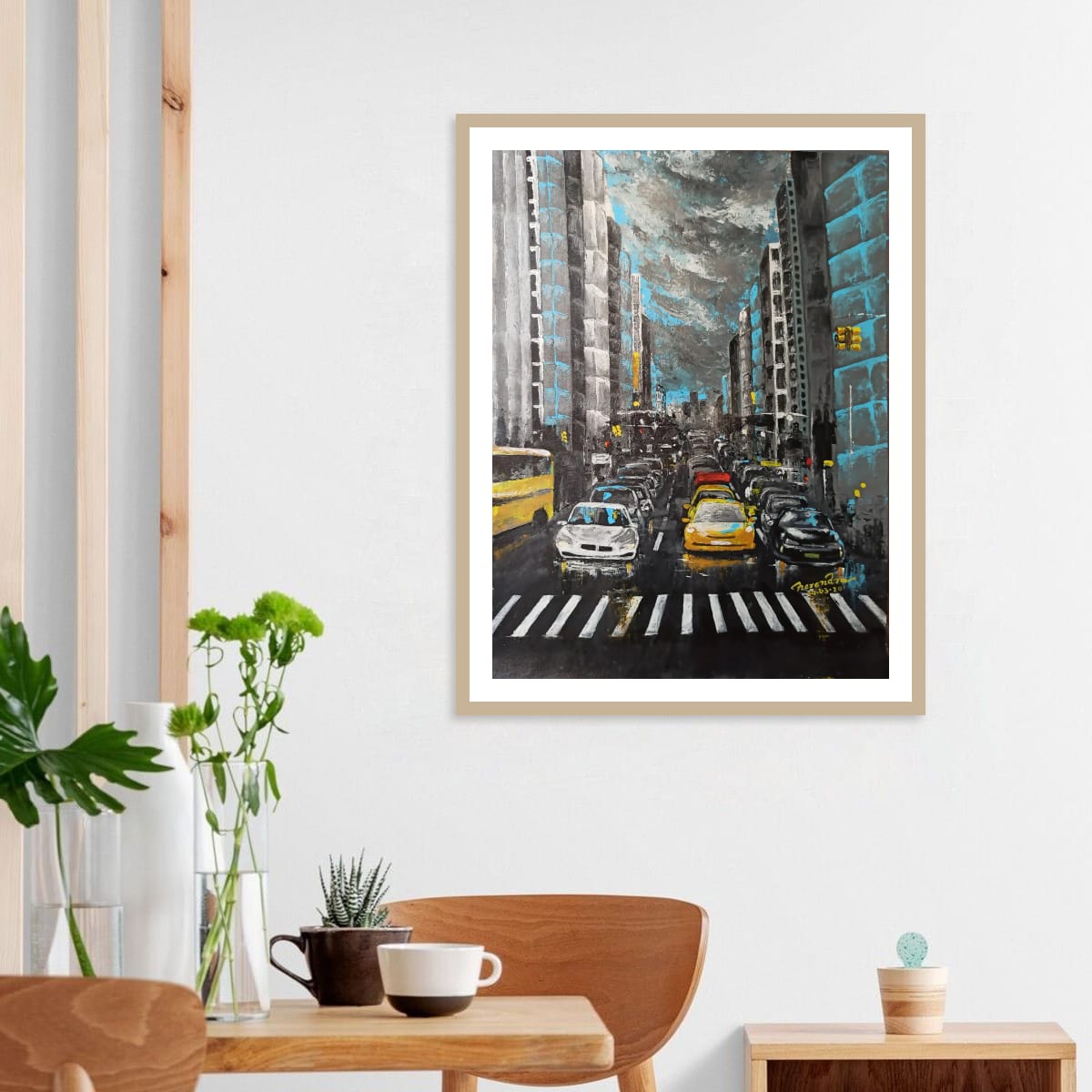 This artwork transforms a typical city crossing into a work of beauty. The chaos of traffic, the sheen of rain-soaked roads, and the reflection of headlights blend into a composition that’s both soothing and stimulating. The scene invites viewers to see daily routines through a lens of artistic appreciation.