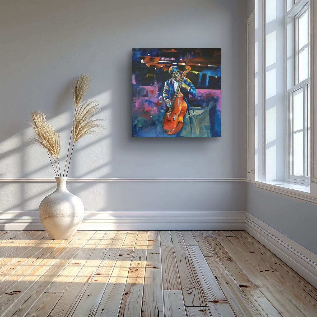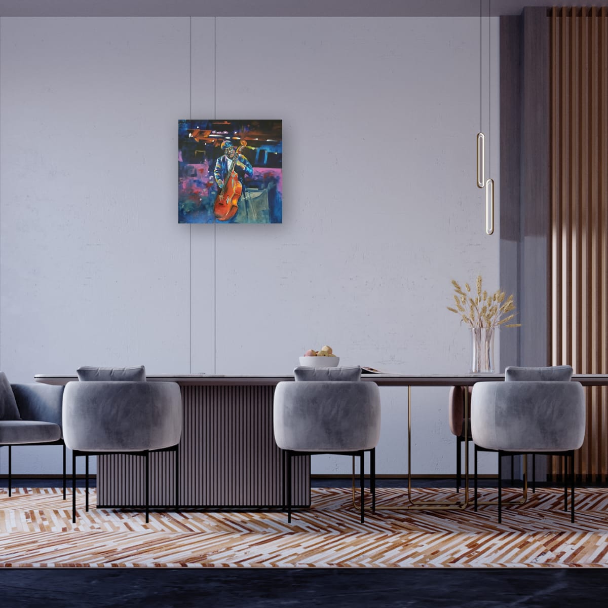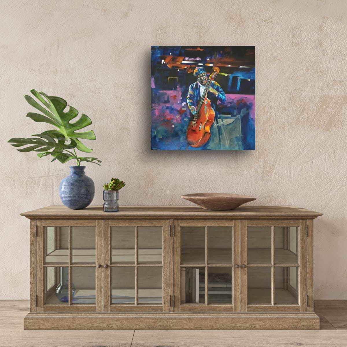 Measuring 24 × 24 inches, this Double Bass Player Painting is an ideal size for creating visual impact without overwhelming the space. It works exceptionally well in areas where a refined yet expressive aesthetic is desired.