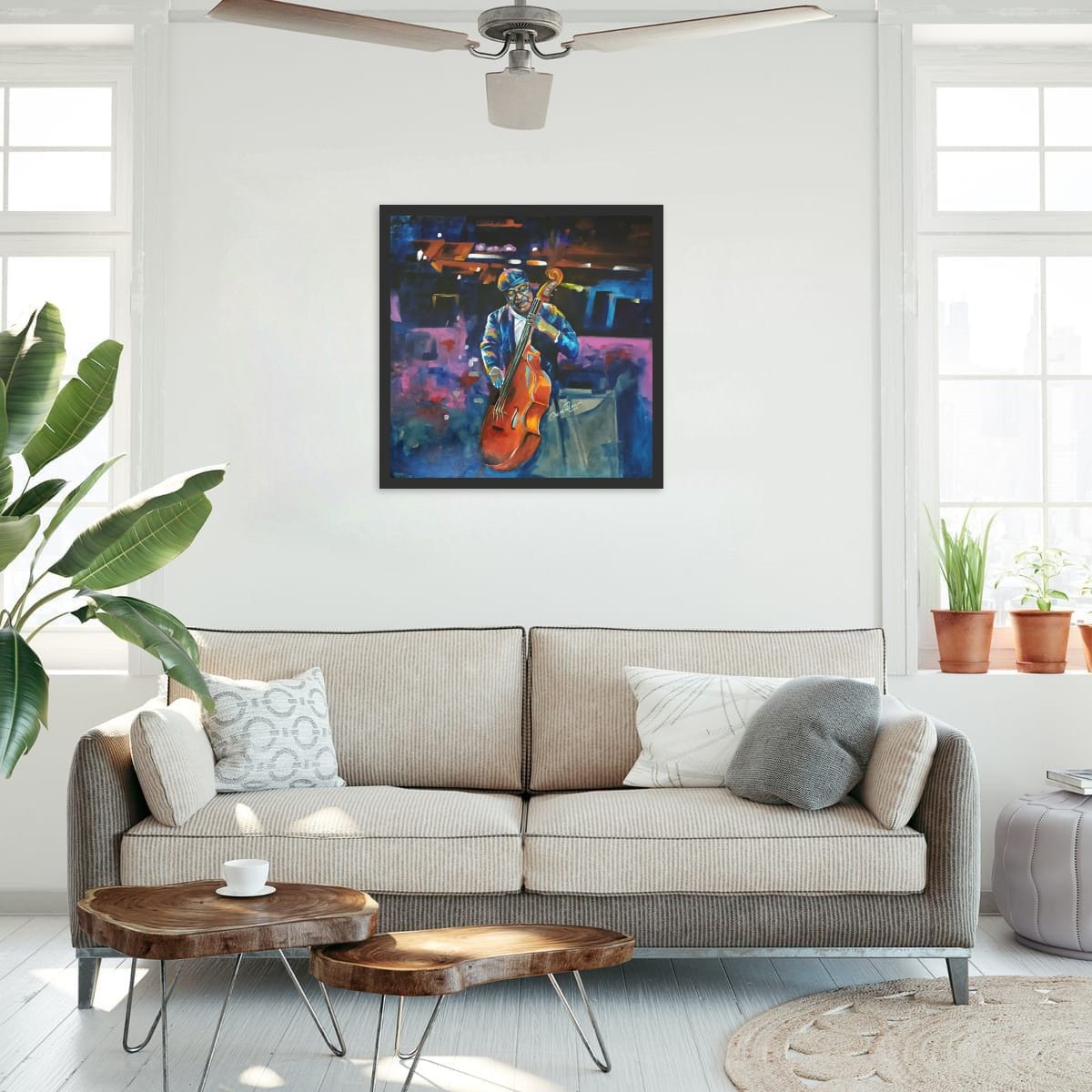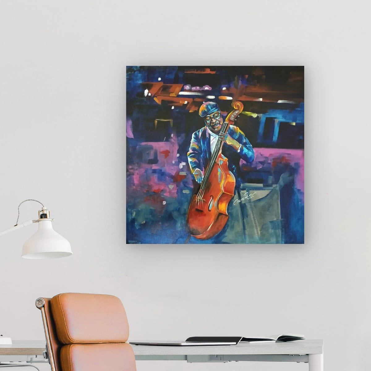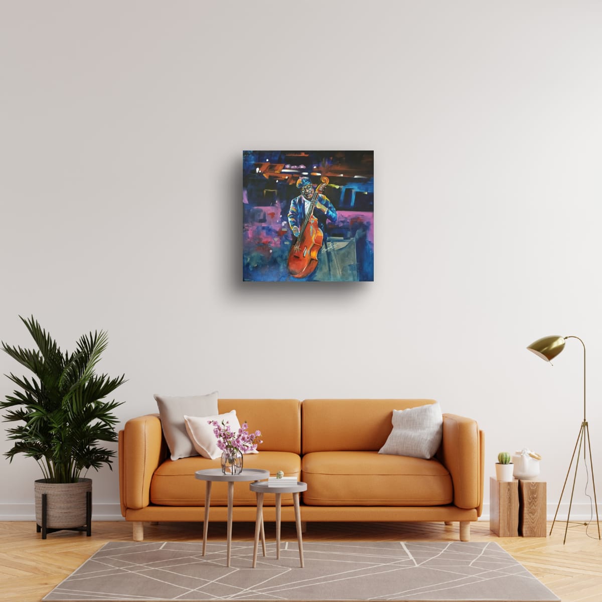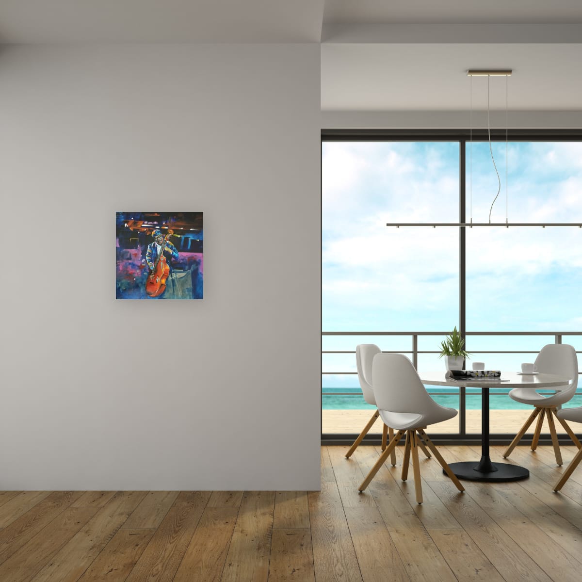 Measuring 24 × 24 inches, this Double Bass Player Painting is an ideal size for creating visual impact without overwhelming the space. It works exceptionally well in areas where a refined yet expressive aesthetic is desired.