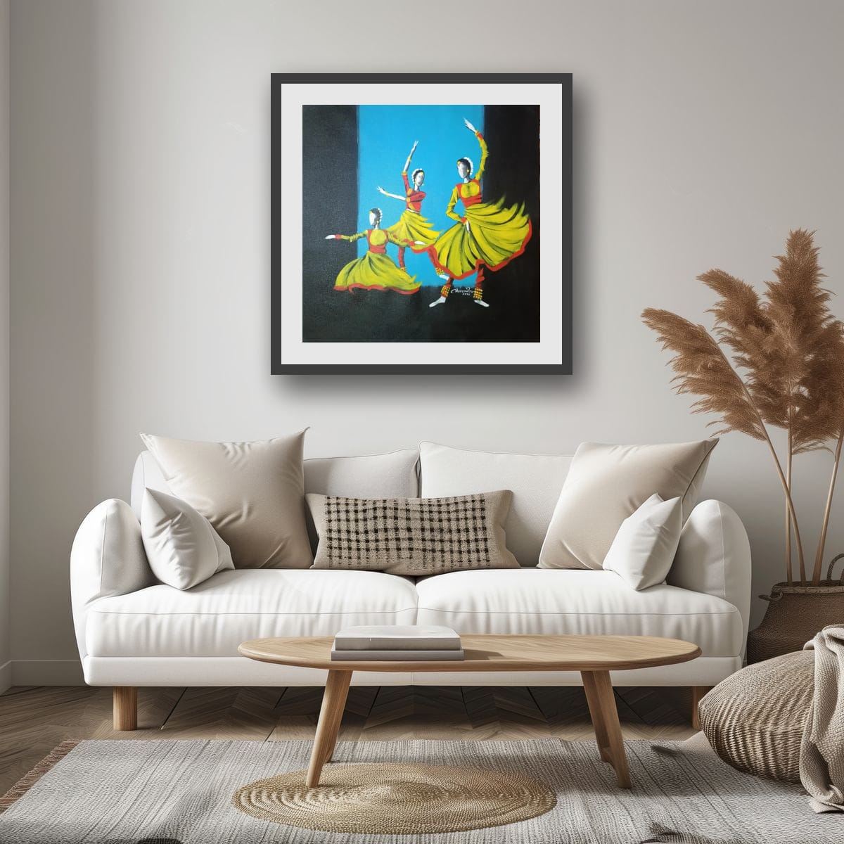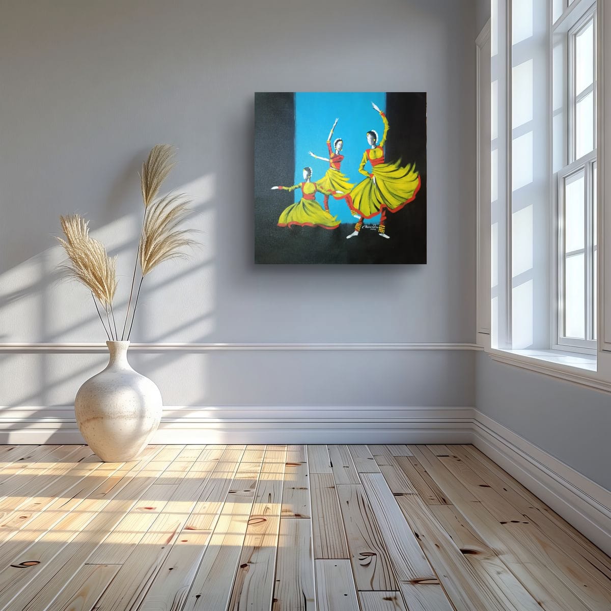 Bring rhythm, elegance, and cultural heritage into your interiors with this Kathak Dancers Painting titled “Taal.” This original acrylic artwork captures the expressive beauty of Kathak, one of India’s most graceful classical dance traditions. Designed to reflect movement and rhythm, the painting celebrates the timeless connection between Indian culture, music, and dance.