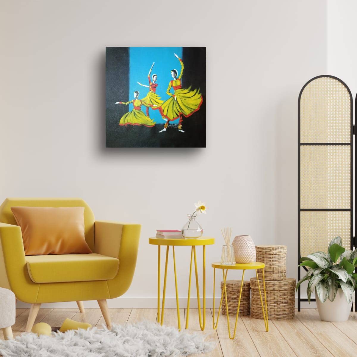 The colour theme plays an important role in the painting’s emotional impact. The vibrant yellow costumes symbolize joy, energy, and movement, while red accents represent strength and traditional elegance. A rich blue background provides a dramatic contrast, allowing the dancers to stand out while suggesting a stage-like atmosphere. Dark surrounding tones add depth and guide the viewer’s focus toward the rhythmic performance at the center.