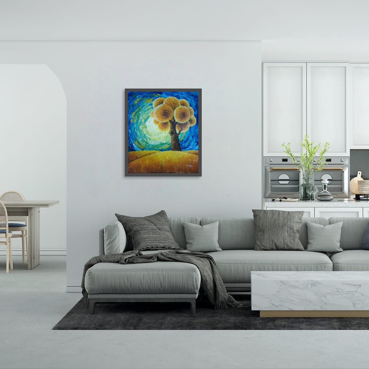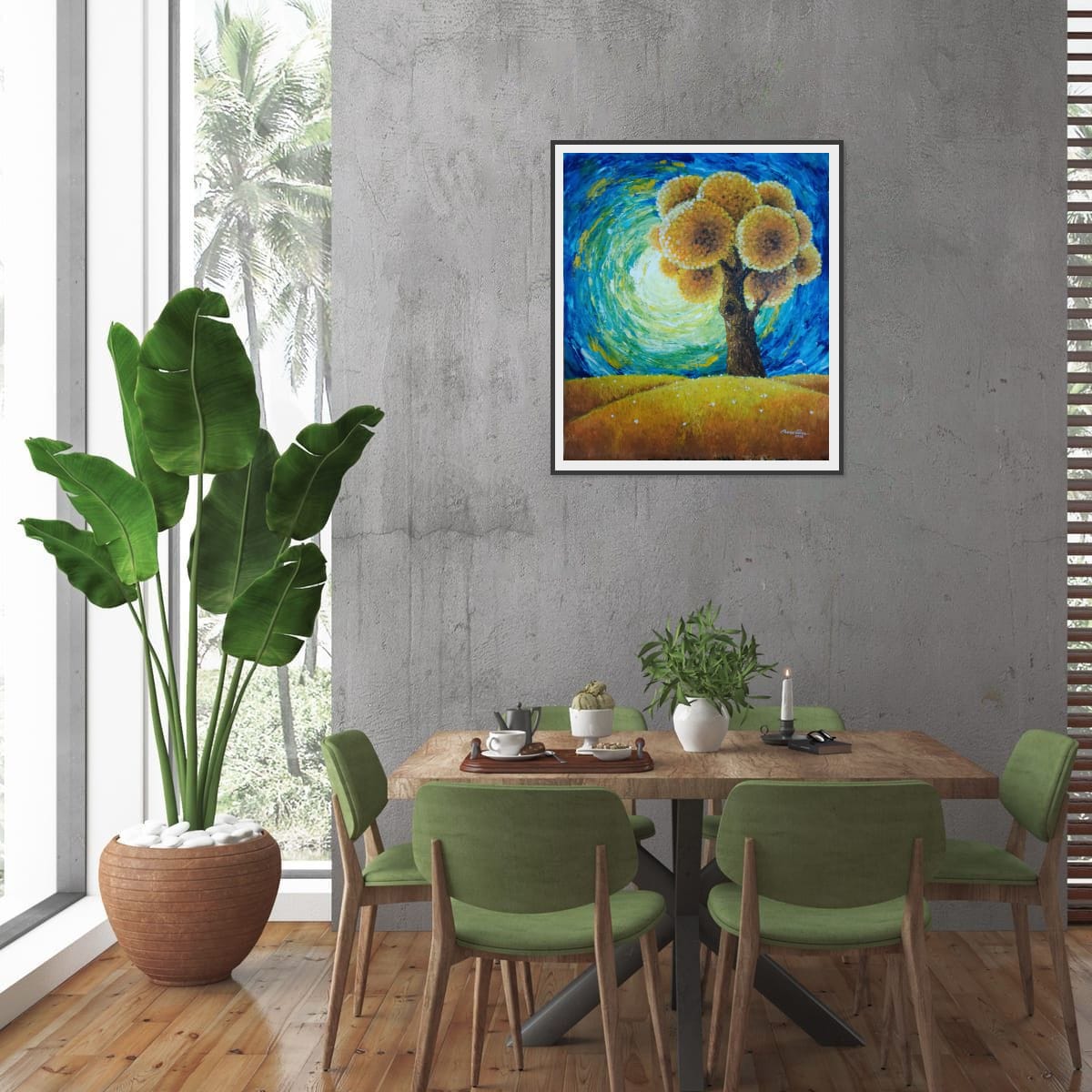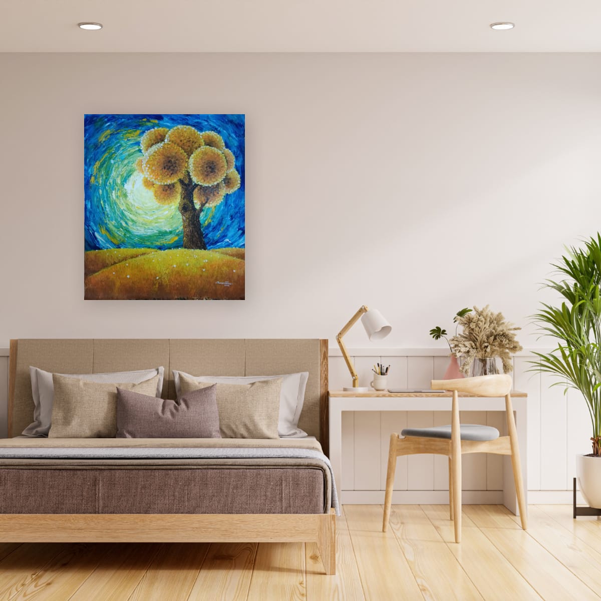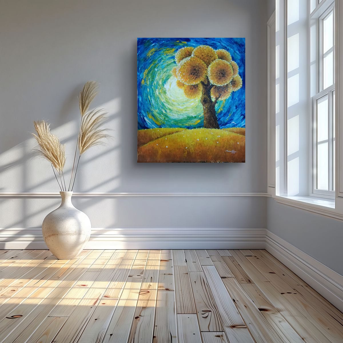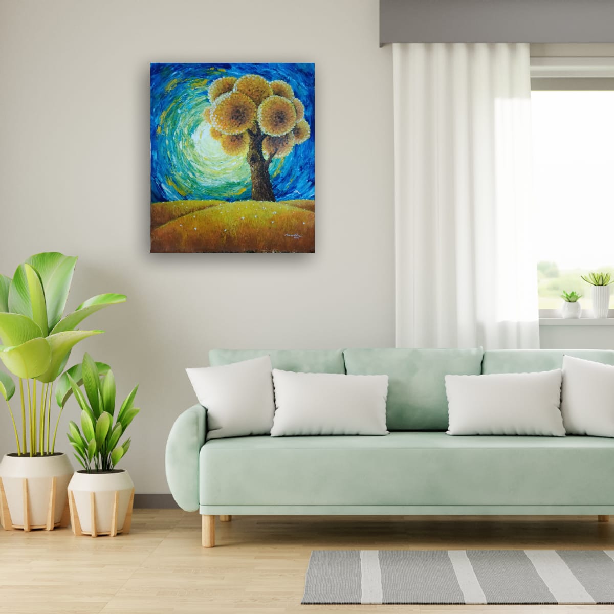 Painted with expressive brushwork and textured layers, this artwork creates depth and visual richness. The strong trunk anchors the composition while the bright canopy spreads outward like a burst of light. The contrast between the warm golden tones and the cool atmospheric blues creates a balanced and captivating visual experience.